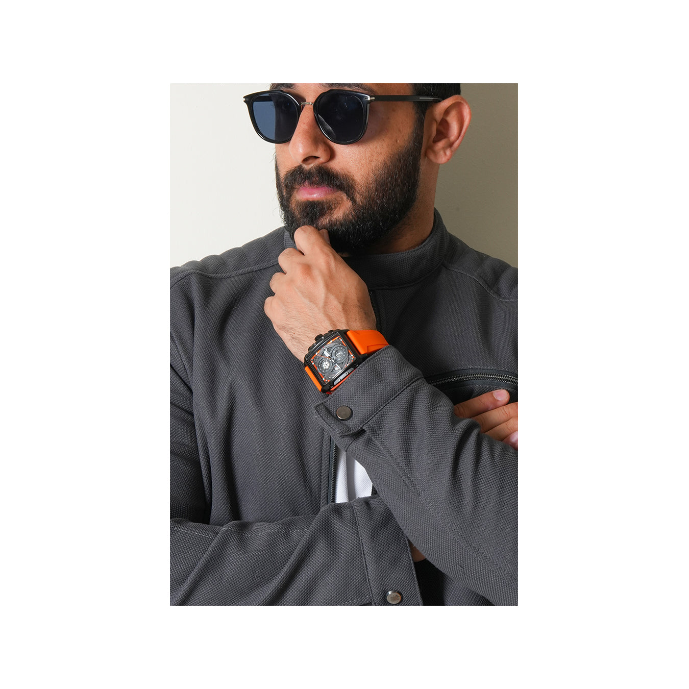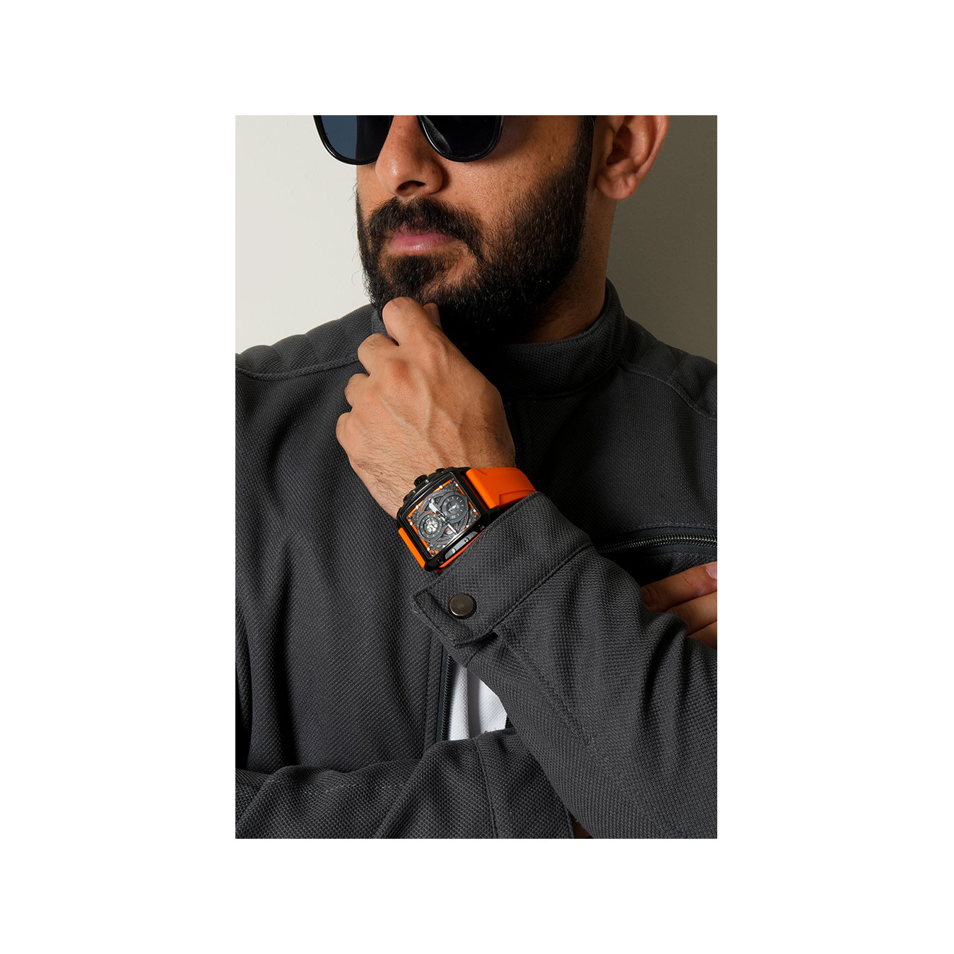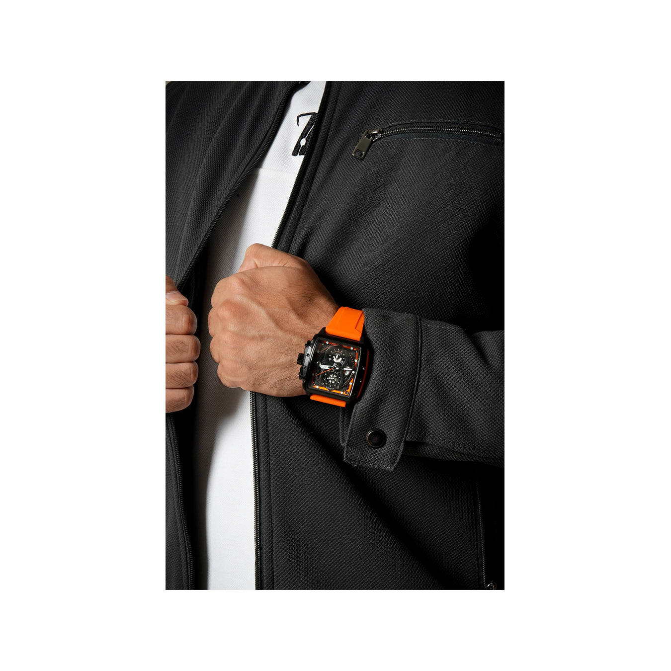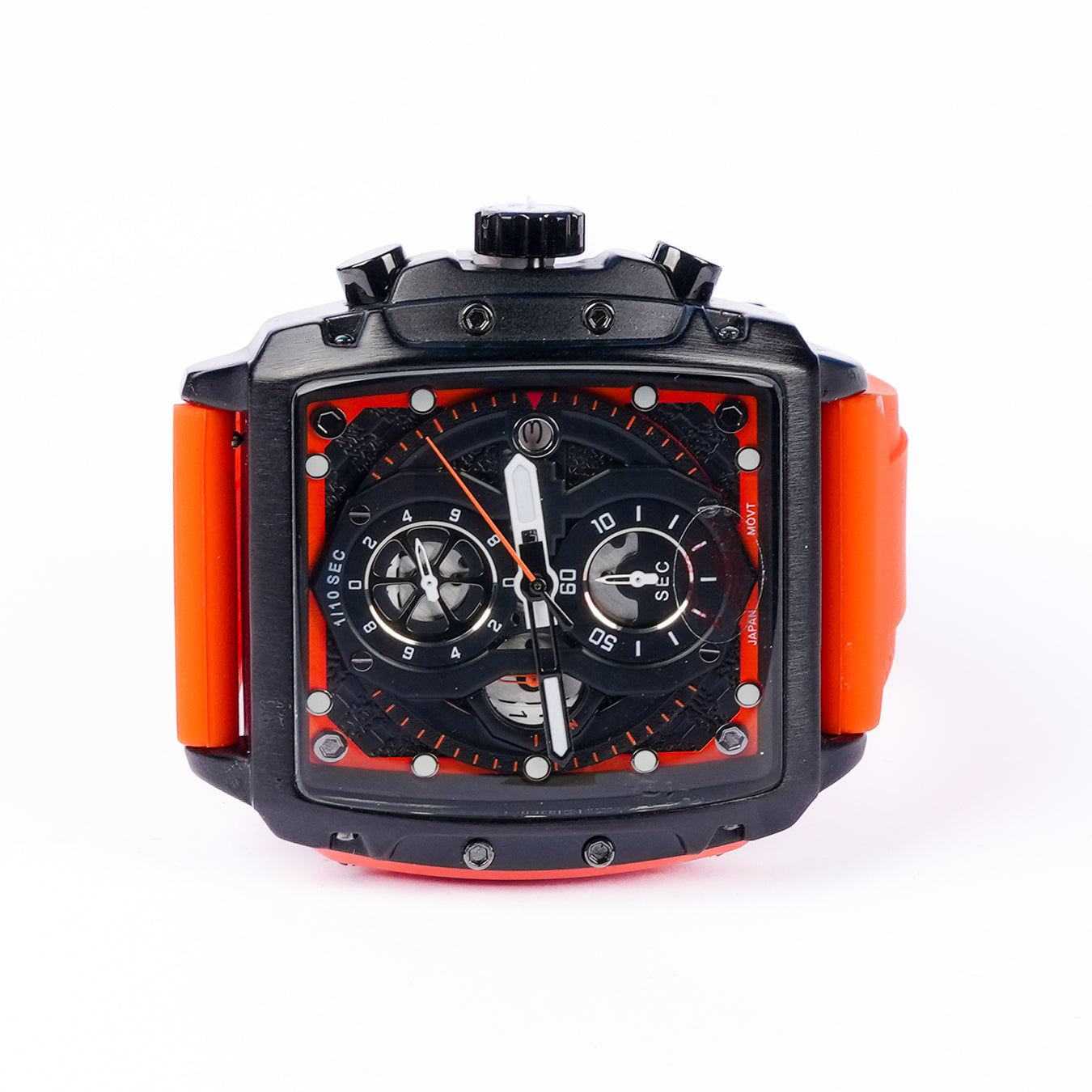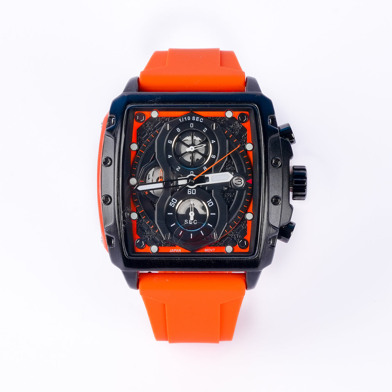 Aurochron Men's Sport Chronograph Watch – Black Square Dial – Orange Silicone Strap – 1/10 Sec Quartz