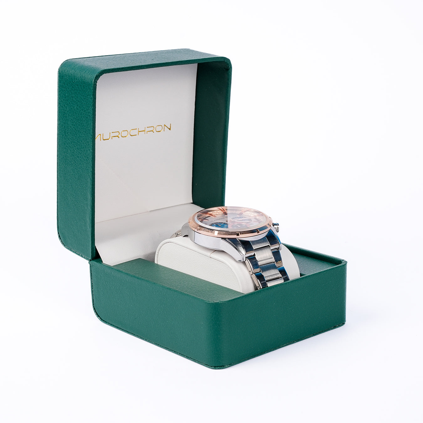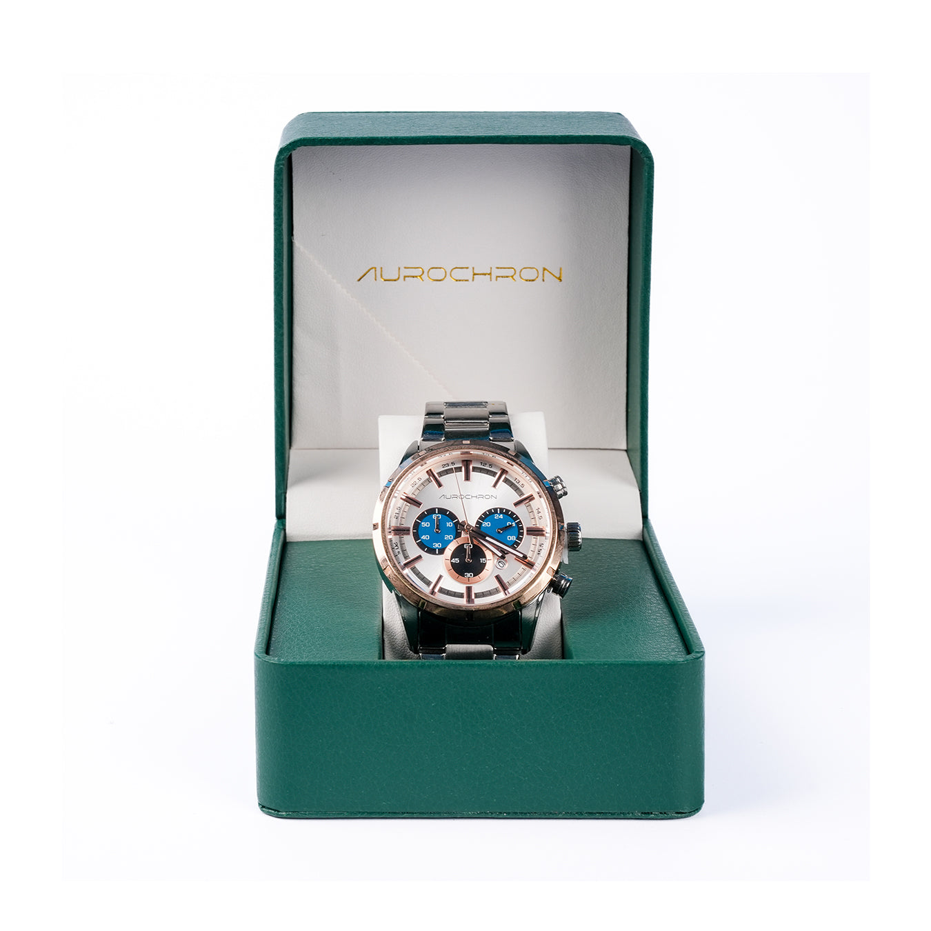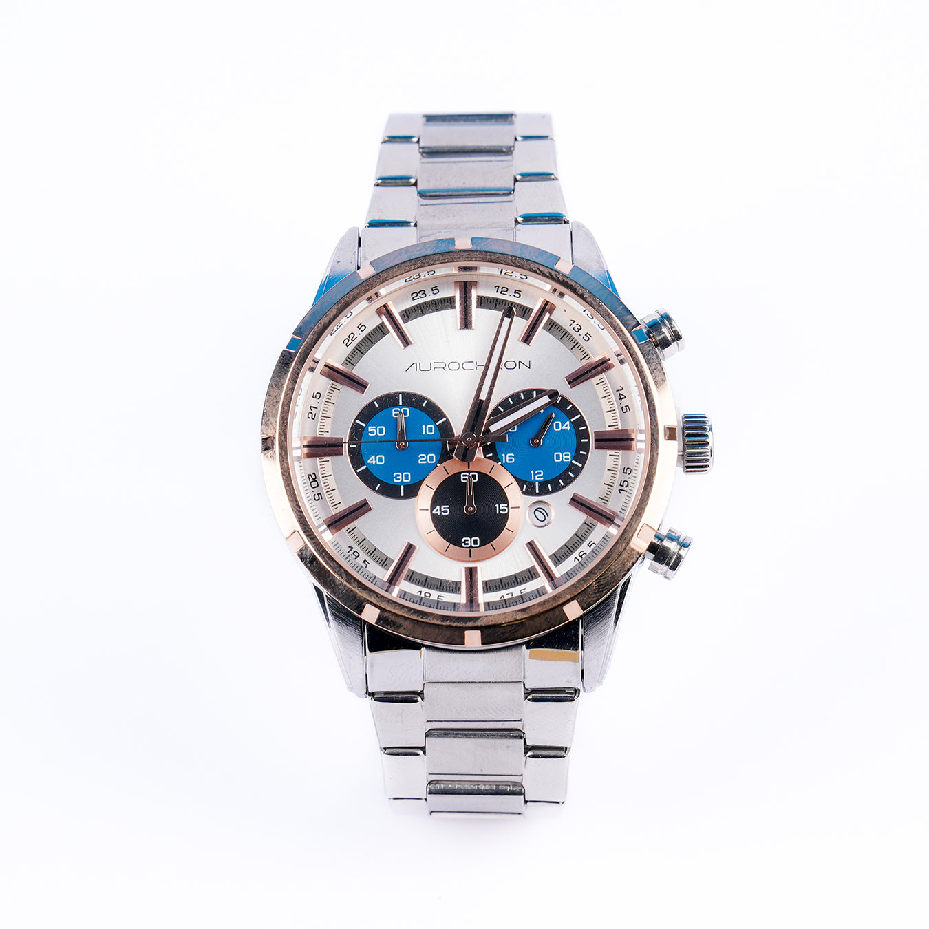 Aurochron Men's Chronograph Watch – Silver Dial with Blue Sub-Dials – Rose Gold Bezel – Stainless Steel Strap – Date Display