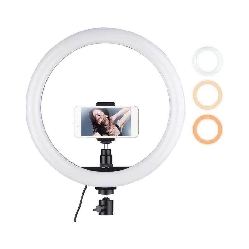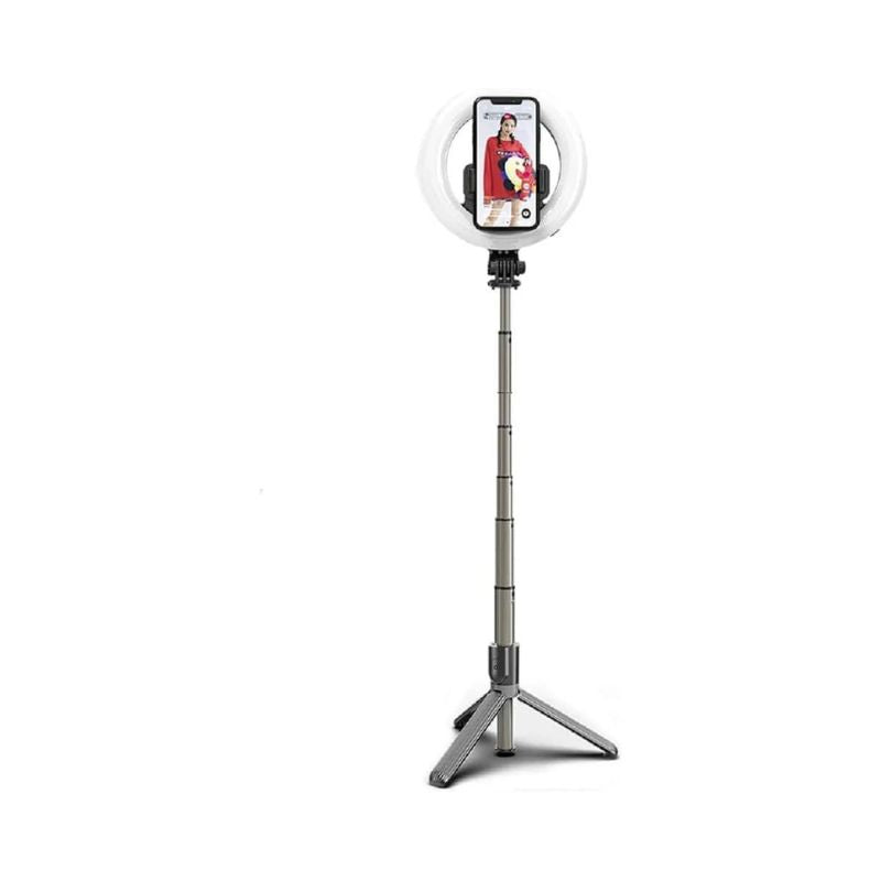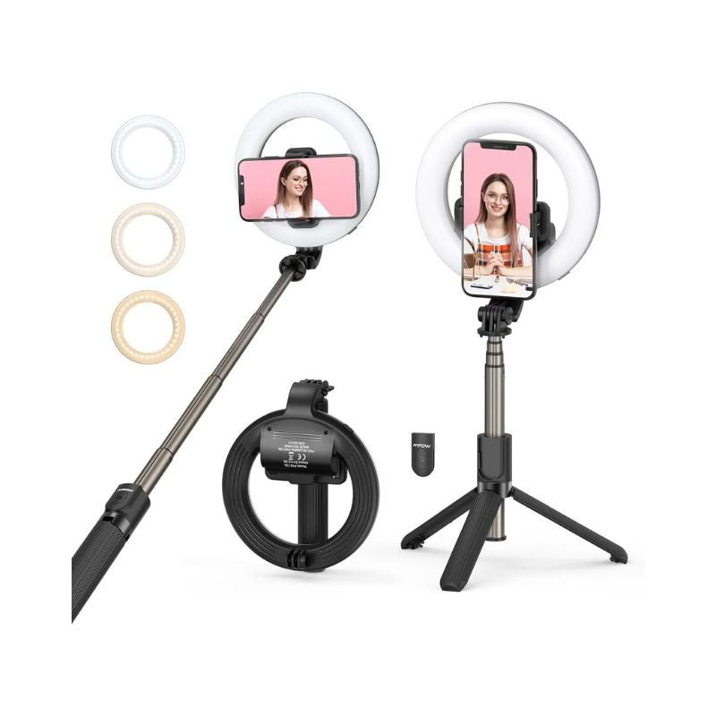 | Key Highlights | 3 lighting modes (White / Soft / Warm) with remote control, extendable 2m stainless steel selfie stick, rechargeable ring light for portable use, and Bluetooth wireless remote for hands-free photo/video capture. |